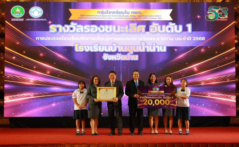 วันที่ 29-30 กันยายน 2568 นายวีรภัทร เณรศาสตร์ สหกรณ์จังหวัดน่าน พร้อมด้วย นายศฤงคาร กันทะโม้ ผู้อำนวยการกลุ่มจัดตั้งและส่งเสริมสหกรณ์ นายเกรียงศักดิ์ หางนาค ผู้อำนวยการศูนย์ถ่ายทอดเทคโนโลยีการสหกรณ์ที่ 12 จังหวัดพิษณุโลก นำคณะครูและนักเรียน จากโรงเรียนบ้านสบปืน และโรงเรียนบ้านขุนน้ำน่าน จังหวัดน่าน เข้าร่วมโครงการเสริมสร้างประสบการณ์และมอบรางวัล ภายใต้โครงการประกวดโรงเรียนจัดการเรียนรู้การสหกรณ์รางวัลพระราชทาน ประจำปี 2568 ณ ชุมนุมสหกรณ์ออมทรัพย์แห่งประเทศไทย จำกัด และโรงแรมปรินซ์พาเลซ กรุงเทพมหานคร วัตถุประสงค์เพื่อให้ครูและนักเรียนได้เสริมสร้างประสบการณ์ด้านสหกรณ์และแลกเปลี่ยนแนวทางการจัดการเรียนรู้การสหกรณ์ในโรงเรียน ซักซ้อมและเข้ารับรางวัลการประกวดโรงเรียนจัดการเรียนรู้การสหกรณ์ ประจำปี 2568 จังหวัดน่านมีโรงเรียนที่ได้รับรางวัล ได้แก่ โรงเรียนบ้าน ขุนน้ำน่าน ได้รับรางวัลรองชนะเลิศอันอับที่ 1 และโรงเรียนบ้านสบปืน ได้รับรางวัล รองชนะเลิศอันดับที่ 3 ประเภทกลุ่มโรงเรียน กพด.